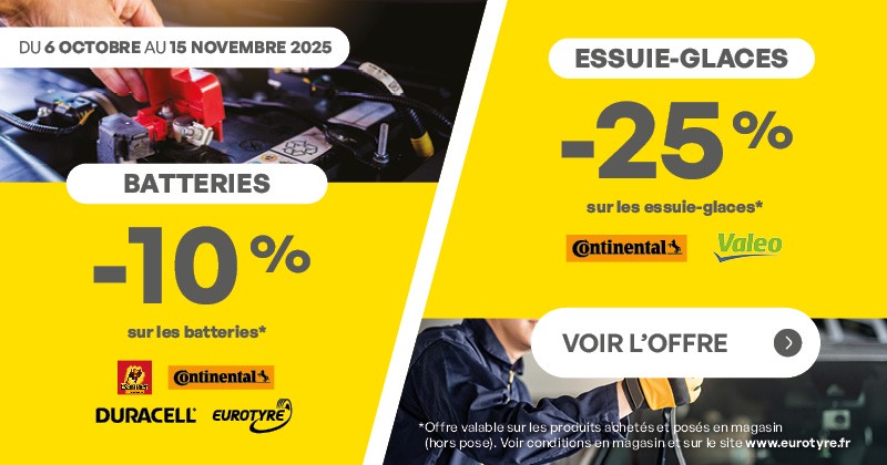 Promo entretien auto : Batteries et Essuie-glaces Du 6 octobre au 15 novembre 2025, profitez de…